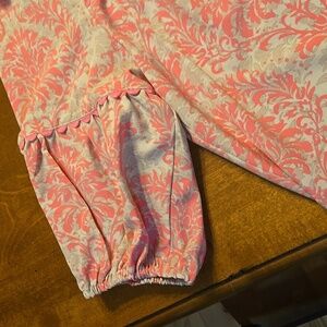 Stylish pink and cream blouse with a unique pattern. Features a tie detail and puff sleeves. Open bottom. Cute RikRak details. Size M. Wore 1x.