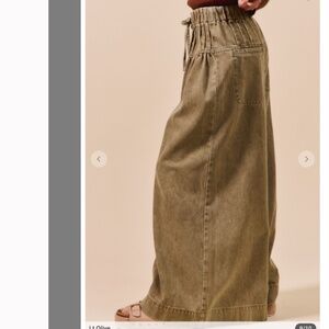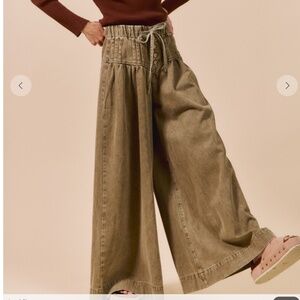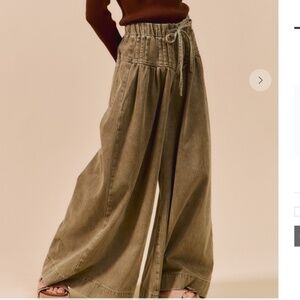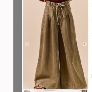 DESIGNED IN MID RISE WIDE LEG WASHED DENIM PANTS WITH BUTTON CLOSURE WITH DRAWSTRING AND BACK POCKETS