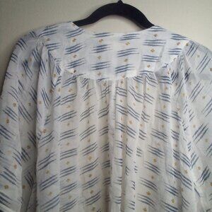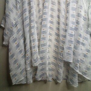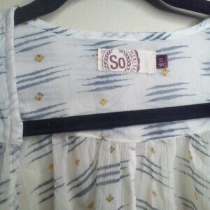 So Open Front Blouse XL Short Sleeve Sheer Patterned White Blue Yellow