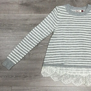 So Striped Long Sleeve Sweater Lace Hem in size L. Great preowned condition. Lightweight acrylic. Please see photos for approximate measurements and details. Item may show difference in color based upon photography and perception. Photos are part of the description, as everyone’s level of condition may vary. From smoke free and pet free home. All packages are shipped the same or next business day.
