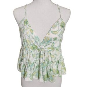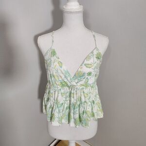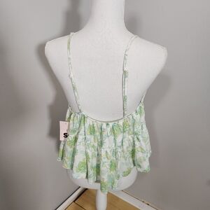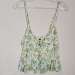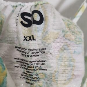 This SO sleeveless camisole features a plunging V-neckline and a ruched detail at the center, with a floral print pattern in soft pastel colors of light green and white. The fabric is light and airy, perfect for warm weather wear. size XXL