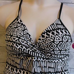 This swimsuit lot includes a tankini top and swim bottoms. The geometric top is black and white with solid black straps. The top has a wire free built in padded push up bra with molded cups. The straps cross in back with ties. The brief high rise bottoms have shirred ruching with adjustable side ties. The top is labeled size XXL and the bottoms are labeled 2X. Both items are new with tags.