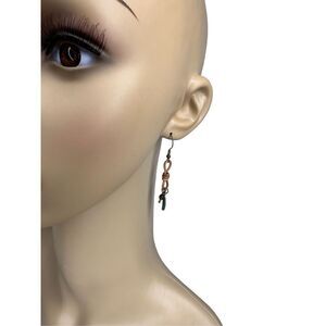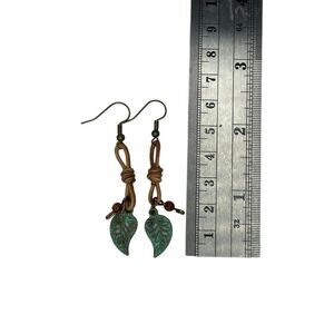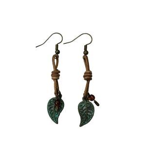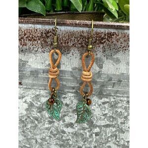 These sweet dangle earrings feature an antique bronze leaf with an aged green patina and a dark rust bead. Barrel knot is made with genuine leather cord.