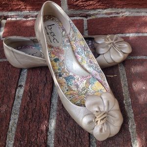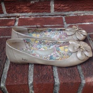 These gold flats are so comfortable. If you're on your feet all day, these are for you! And cute flower detail on toe. Size 8. Hardly worn!