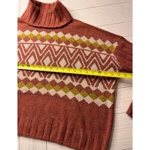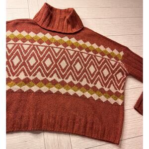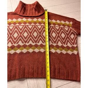 So ladies cropped boxy turtleneck poly sweater w/ flare sleeves. Rust, cream, brown. Sz XL