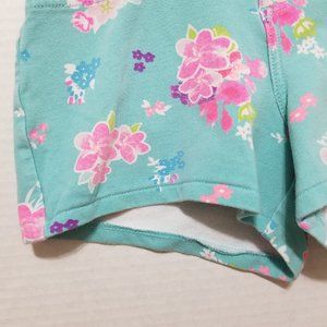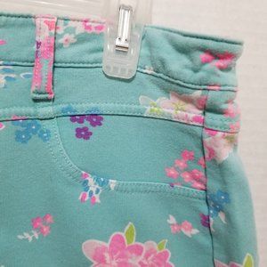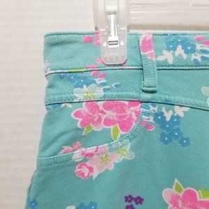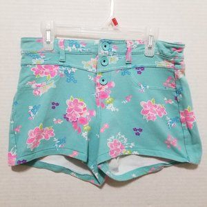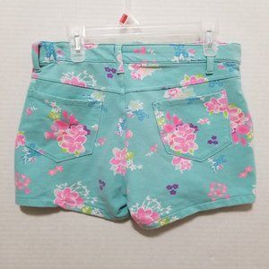Floral print shorts. Non-functional front pockets, real back pockets. Adjustable waist. Three snap button fly. 2015. Stretch, girly, feminine, summer.