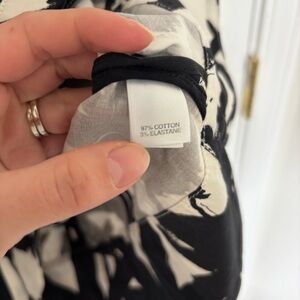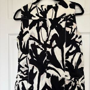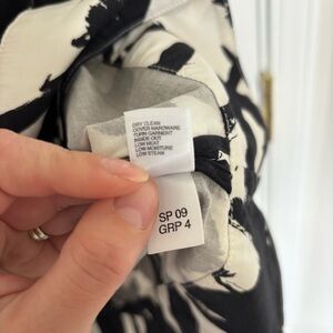 SoCa St. John Black White Patterned Dress Size Small. 97% cotton and 3% elastane. This is dry clean only and I washed it in the regular washing machine and ruined the dress and caused the dye to bleed. Plus there are a few stains on the dress as shown in the pictures. This dress has pockets and a tie waist