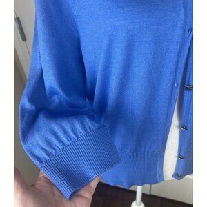 Beautiful classic cardigan from SoCa St. John. The cobalt blue is striking, finished with subtlety faceted small silver buttons. 3/4 length sleeves, round neck.