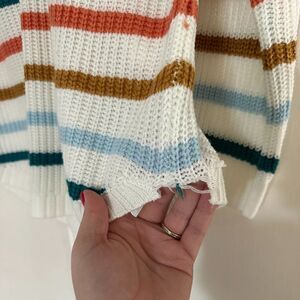 So striped sweater, white base with tan, orange, blue, and teal stripes. Sweater is in good condition, with some unravelling on a sleeve cuff as shown in the third picture. Smoke free, pet friendly home.