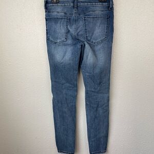 Classic pair of distressed stretch fit skinny jeans in excellent preowned condition. They measure 15 inches at the waist laying flat and have a 30 inch inseam.