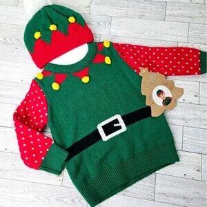 So'Dorable Baby Elf Holiday Christmas Sweater Set Matching Hat Beanie 6-12 Month