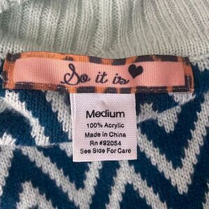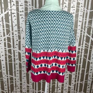 So It Is Aqua Teal Chevron Zig Zag Print Longline Open Front Cardigan sz M. Features soft and warm 100% acrylic in a pretty chevron & geometric print in shades of aqua/mint green, teal, orange & magenta pink. Longline open front fit. Gently worn and clean with some light pilling and one tiny snag on the lapel (see pic). If you love colorful pieces, this is a good one for you!
