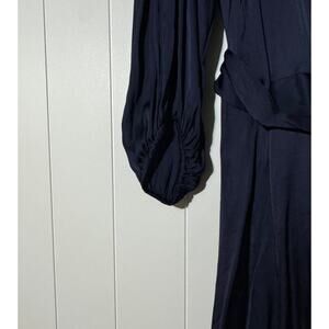 A modern wrap dress with flattering silhouette and European flair. In deep navy with puff sleeves and adjustable tie belt, it offers a dramatic asymmetrical hem and front slit to hit around the knee. The V-neckline frames elegantly and allows versatile layering. Ideal for dinners, events, or day-to-night transitions. Ships with original tags; pristine, never worn.