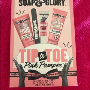 Indulge in the luxurious Soap & Glory Pink Pamper Set. This set includes nourishing hand cream and foot cream in a delightful pink hue. Perfect for a complete pampering experience.