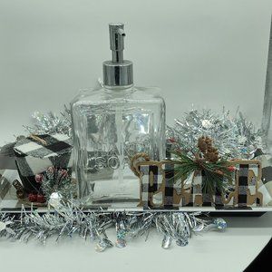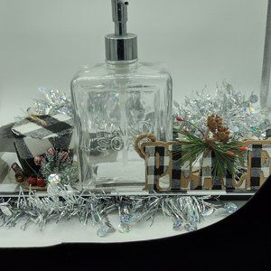Buffalo plaid tray with soap dispenser to,just add your favorite hand soap.A pretty wash set up just in time for family gatherings.