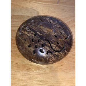 This Unbranded Soapstone Incense Burner Bowl Dish with a pierced lid is 4 inches and features intricate carvings. The rich brown color adds an earthy touch to any room.