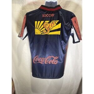 The product is a Chivas De La Guadalajara soccer jersey sponsored by Coca Cola, featuring a multi-color design. This fan apparel is in size M-L, representing the football team Guadalajara. It is an official jersey with logos and branding from the team, making it a must-have for fans of the club and Coca Cola supporters alike. Ideal for wearing during matches or as a collectible item for fans of the team.