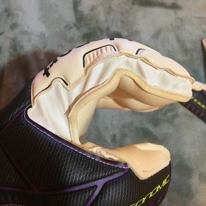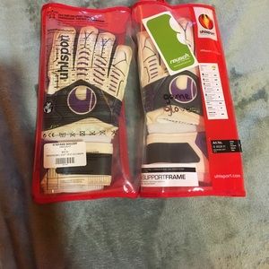 Cream, purple and black Uhlsport goalie gloves. NWT SIZE 8. Soft palm with Velcro wrist and backbone/finger savers.