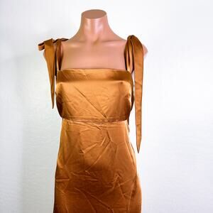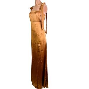 Social Bridesmaids 8224 Charmeuse Tie Shoulder Slit Maxi Dress Toffee Sz M NWT