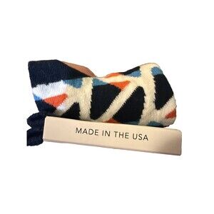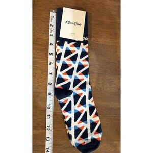 Brand new Social Climb crew socks featuring a bold geometric triangle pattern in navy, white, blue, and orange. Premium combed cotton blend for a soft, breathable, and durable feel. Designed in Austin, Texas and manufactured in North Carolina Made in USA quality. Smooth stretch construction with reinforced heel and toe for everyday comfort.