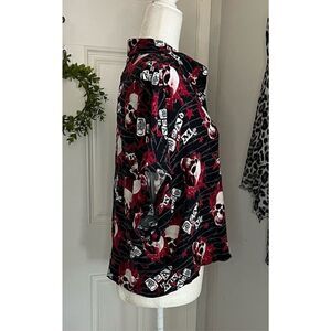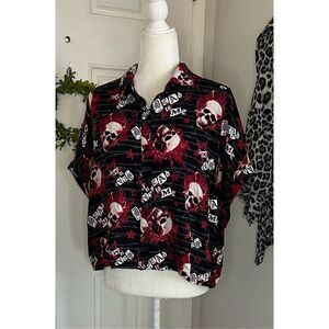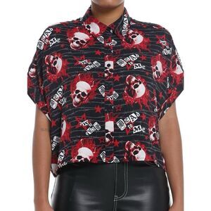 Social Collision Flaming Skulls Allover Print Girls Woven Button-Up (Med)