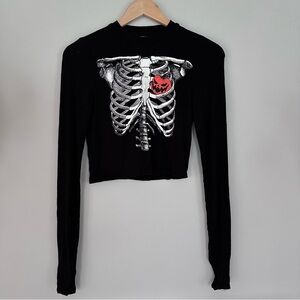 Social Collision Pumpkin Heart Ribcage Crop Long Sleeve Black Tee Size XS