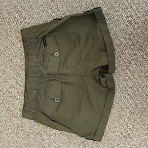 women's olive green shorts by Social Standard by Sanctuary sz Xsmall. 98% cotton, 2% spandex. 10" rise, 30" waist. 4" inseam. back pockets have button