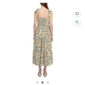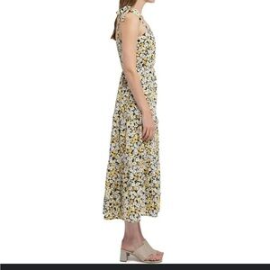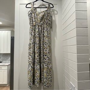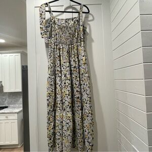Black/yellow/white/light purple floral maxi with ties at shoulder.