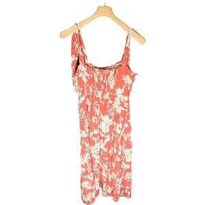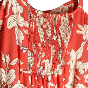 Social Standard by Sanctuary Women's Coral & White Tropical Floral Smocked Dress. Size L. Features coral shell, white tropical floral print throughout, adjustable tie strapes, Adjustable tied sleeves, 3-tier smocked ruffle, maxi length, pullover construction, 100% polyester. EUC / excellent used condition.