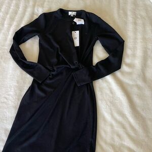 Chic black dress with twist at waist. Long sleeves for elegant style. Perfect for versatile wear.