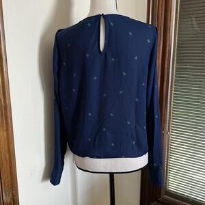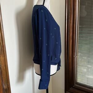 This is a cute blue blouse with tiny green cactus prints. Has a side tie in the front. Button closure in the back. Comes with extra button, listing this as new without tags. There is one observation on the left shoulder, looks like a light colored thread embedded in the material (see last 2 pics). Otherwise no other flaws or damage to note.