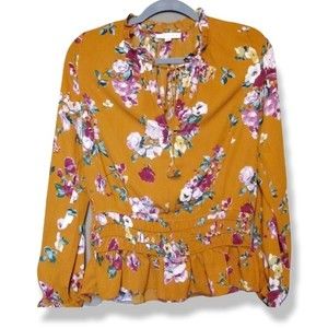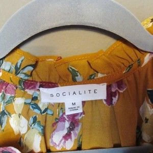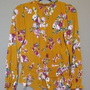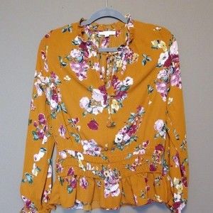 This is a gorgeous blouse by Socialite. Tie tassel front with elastic around the waist and wrist. gorgeous mustard color with floral print size medium . Perfect condition