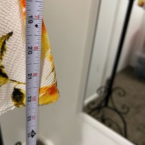 Chic floral blouse with vibrant yellow and red flowers. Features a flattering V-neck and short sleeves. Perfect for casual outings.