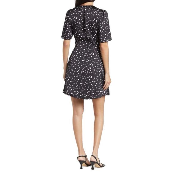 Socialite Flutter Sleeve Wrap Dress In Black/ White Print, Size Small NWOT- A short-sleeve faux-wrap dress with an extended waist tie embedded in sultry satin.