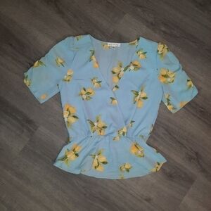Socialite lemon pattern blouse. V-neckline. Short sleeve with ruching on sleeves. Elastic sinched in waist detail. Size XS.