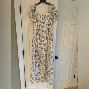 Cute white floral dress. Sleeve is meant to wear off the shoulder. Has a slit up one leg that hits below the knee. Also has a slip underneath that comes to the knee so you do not see through. Worn once. Excellent condition.