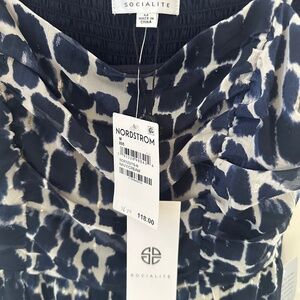 Socialite Metallic Gathered Maxi Dress. This Socialite maxi dress features a square neck, sleeveless construction, and a side slit. It is a maxi style with a hidden side-zip closure and is lined. The dress has gathered details and shimmery metallic fibers. It is composed of 98% polyester and 2% metallic fibers.