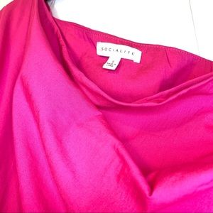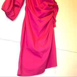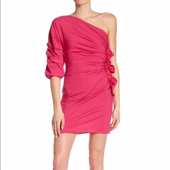 NWOT, Socialite One Shoulder Ruffle Ruched Pink Mini Dress. Long sleeve with hidden side zipper closure. Ruffle on one side and ruched on arm. Flattering fit.