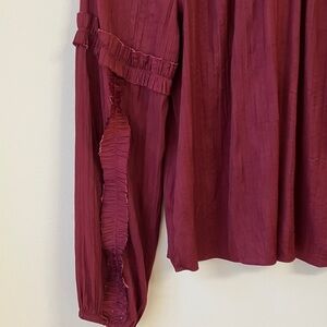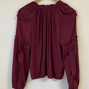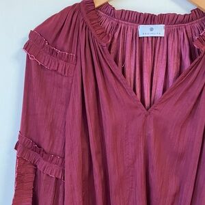 Chic blouse with raw edge ruffle accents. V-neck design. Ideal for stylish outings. Gorgeous color. From Evereve. No size tag but it’s 22” pit to pit, 23” length, about a medium.