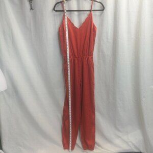 This is gorgeous, and for the utmost confident lady. Adjustable spaghetti straps, scalloped v-shaped neckline, and elastic at waist and ankles. True red, patterned fabric mimics silk with its shine. Fully lined and in excellent condition!