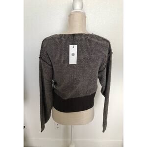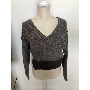 This sweater is perfect for those chilly days.It is a V-neck style and features a cool loop design. The charcoal color is perfect for pairing with jeans and boots. The bottom hem is a solid dark charcoal band that gives it added style. It is cut to hit at the top of the hip or the pant waistband. New with tags.