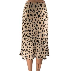 Socialite Tan Black Silk Satin Leopard Animal Print Midi A-line Slip Skirt Size S