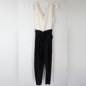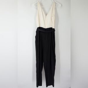 Socialite White Floral Satin Black Sleeveless V-Neck Wide Leg Jumpsuit Large