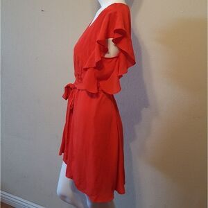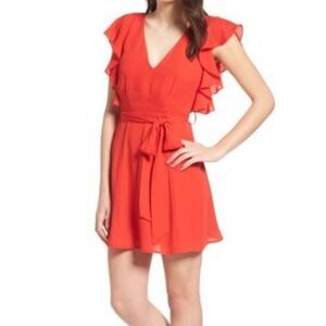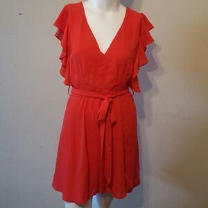 This floaty V-neck dress maximizes contemporary charm with dainty ruffled sleeves and a matching belt. This style fits true to size.