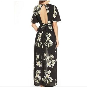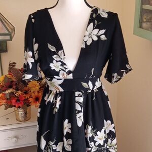 Dark floral textured fabric. A cross between a jumpsuit and a romper. Deep V in front with floaty sleeves. Wide waistband. Wide leg, lined shorts. Full maxi overskirt that floats away as you walk. The back has a low square shape. Size M measures 38 at chest. 30 at waist, 40 at hips, shorts: 13 inch rise. 60 long from shoulder to hem. The perfect party dress.