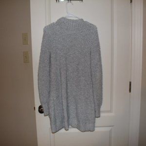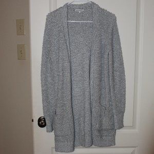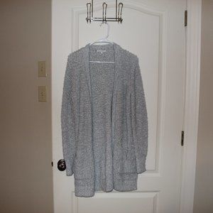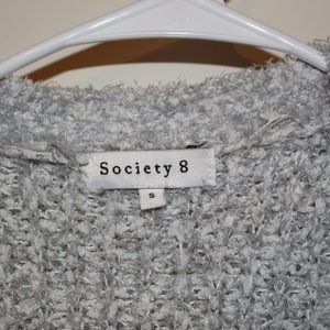 This is a super soft and fluffy long light gray/blue colored cardigan from Society 8. It's perfect to wear over any top in the winter with jeans or leggings. Worn a handful of times. Let me know if you have any questions!