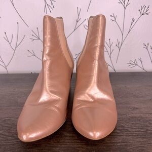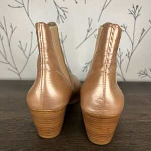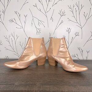 Step out in style with these chic rose gold metallic ankle boots. Perfect for any occasion, these boots add a touch of elegance to your outfit. Pointed toe, stacked leather heel. Elastic bands for easy pull on. Pre-loved, a lot of life left.