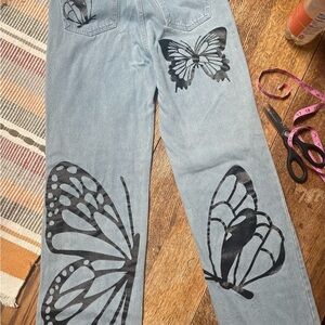 Society Black and Blue Flare Jeans with Artistic Butterfly Design. Boho