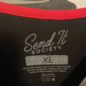Bold 'Conquer and Repeat' print. Black body with gray camo sleeves. Casual and stylish.