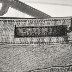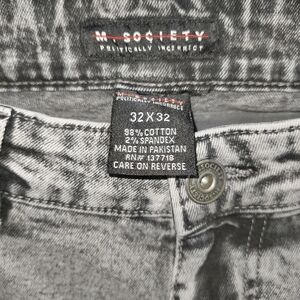 Embrace a modern edge with these Society gray skinny jeans, featuring heavy distressing and a vintage-like worn appearance. The faded gray wash and frayed edges around the rips add a unique character, while the whiskering near the hips enhances the trendy design. Perfect for those seeking a stylish and contemporary look.